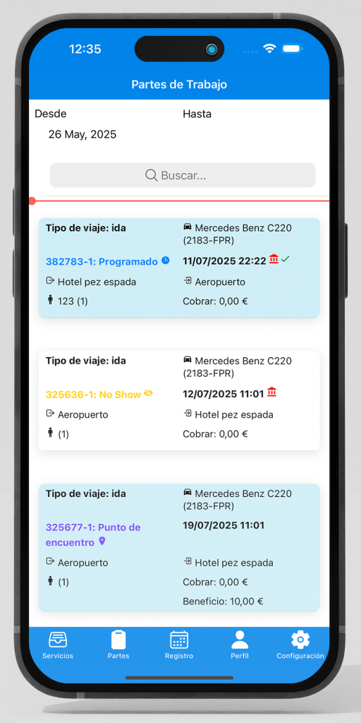 Una vez realizados los pasos anteriores, el conductor debe cerrar sesión en la app VeoTransfer Conductores y volver a abrir sesión, y le aparecerá un nuevo icono llamado Registro. Al pulsar en Registro podrá ver un listado con los registros horarios realizados y dos botones: