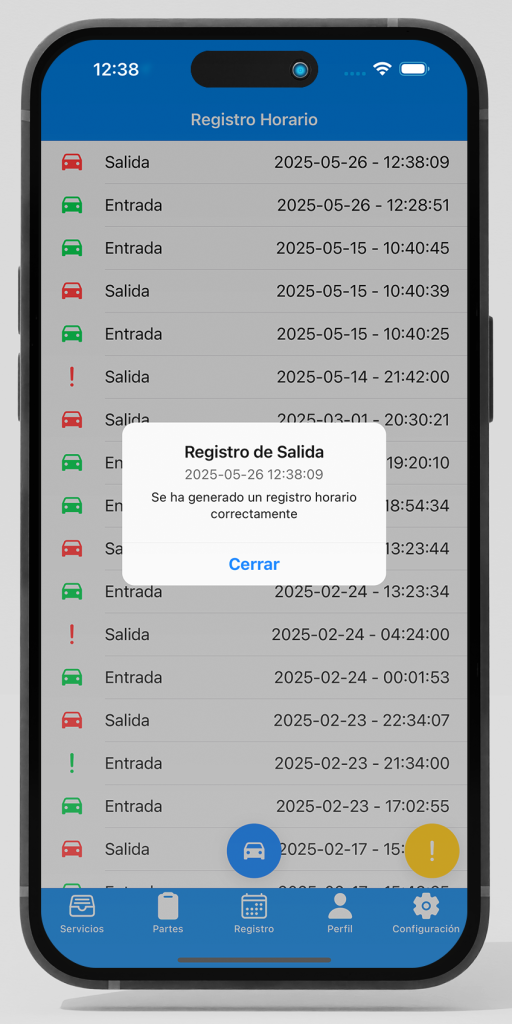 - Botón azul con un coche para iniciar o finalizar la jornada.