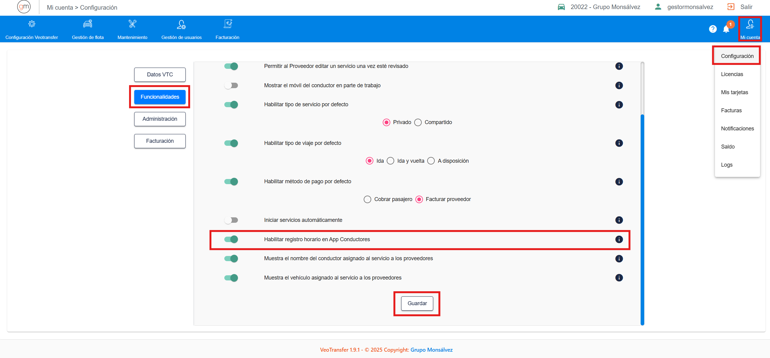 Acceder a la gestión de la flota a través app.veotransfer.com con el navegador, y navegar hasta Mi cuenta > Configuración. Una vez allí, pulsar en Funcionalidades, activar la opción «Habilitar registro horario en App Conductores» y pulsar en Guardar: