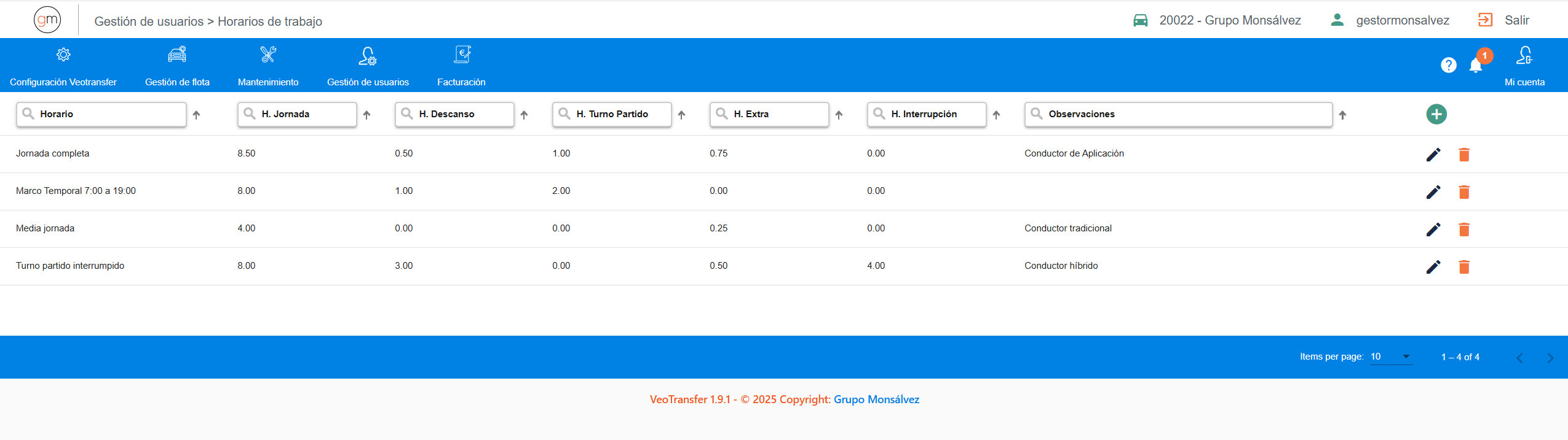 Navegar hasta Gestión de usuarios > Horarios de trabajo, y generar al menos un Horario de trabajo. Hemos implementado una serie de parámetros a rellenar según proceda. Ante la duda, deben consultar a su gestoría o revisar la normativa vigente. Este horario de trabajo no lo verá el conductor, pero sirve como referencia al empleador.
