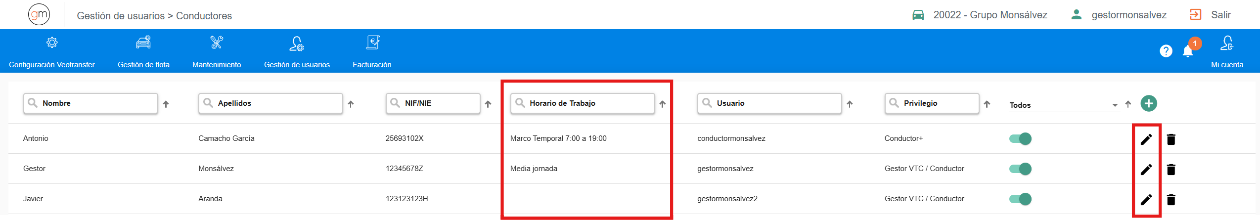 Navegar hasta Gestión de usuarios > Conductores y, para los conductores que deseemos que realicen el registro horario, editar cada conductor y asignar uno de los Horarios de trabajo creados.