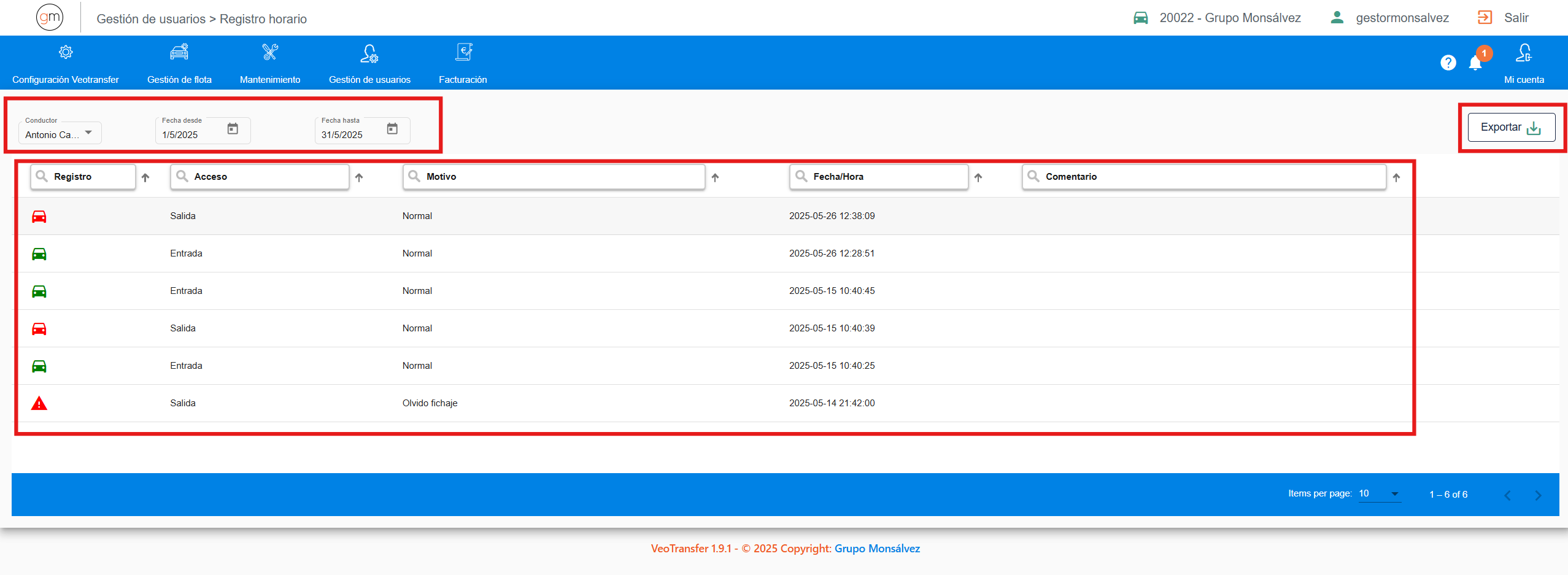 El gestor, desde la web, en Gestión de usuario > Registro horario, puede filtrar por fechas y conductores, y visualizar y exportar los registros horarios de cada trabajador